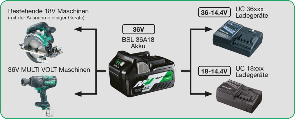 Die innovative Akku-Technologie des japanischen Elektrowerkzeug-Herstellers macht den Einsatz von 36-Volt-Akkus in 18-Volt-Geräten möglich.