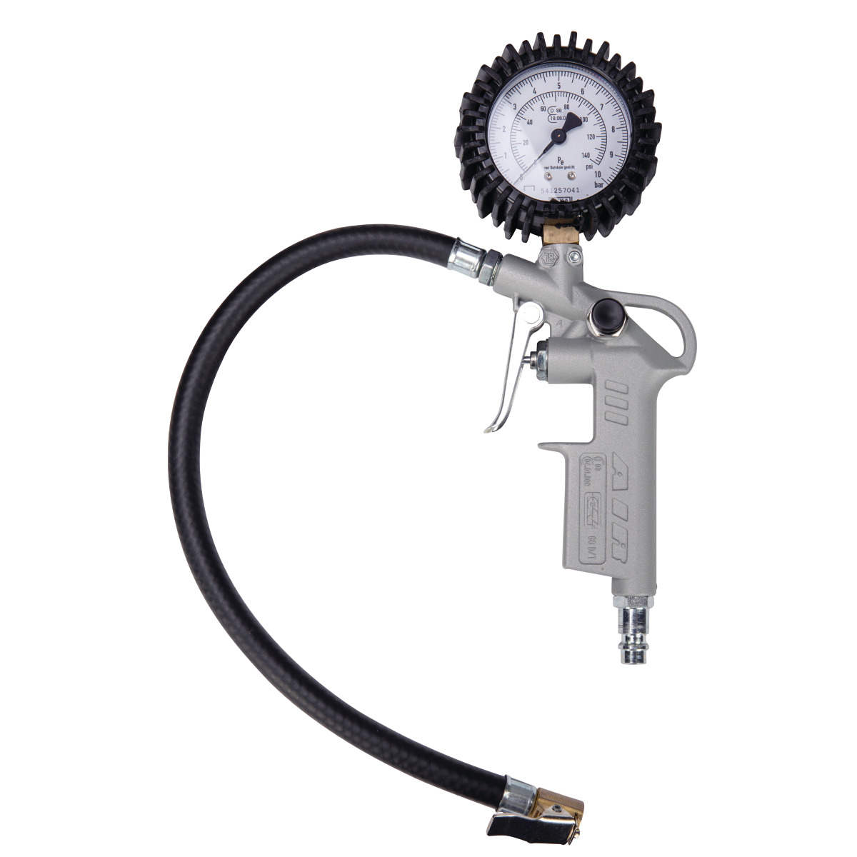 Die Aircraft Kompressorenbau und Maschinenhandel GmbH stellt eine geeichte Reifenprüf- und Befüllvorrichtung mit Schnellstecker her, die einen Messbereich und Arbeitsdruck von 0 bis 10 bar bietet und etwa 0,39 kg wiegt.
