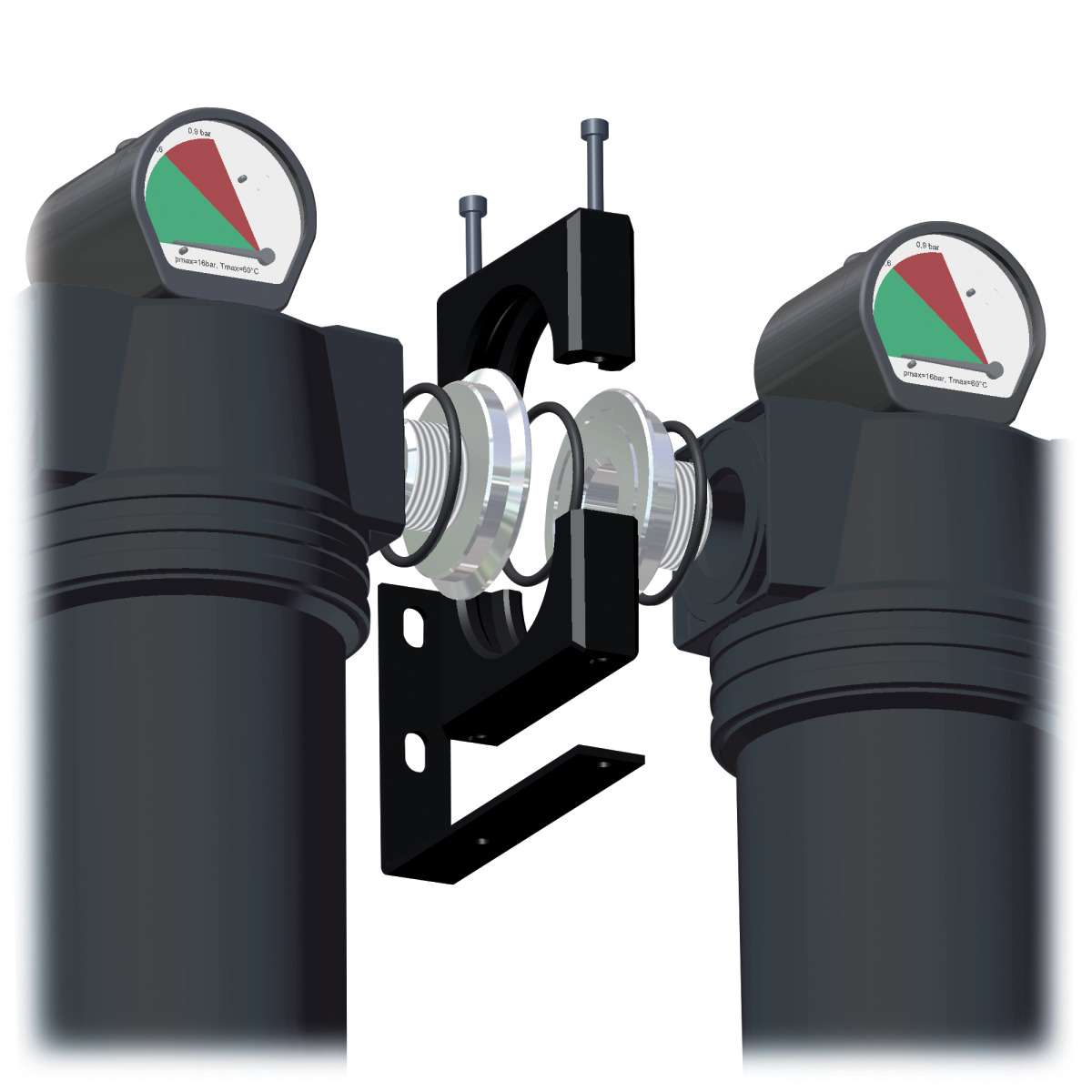 Das Verbindungsset der Aircraft Kompressorenbau und Maschinenhandel GmbH ermöglicht die Kombination zweier Gehäuse und enthält Winkel zur Wandbefestigung, wobei es auch mit Gehäusen anderer Produzenten kompatibel ist.