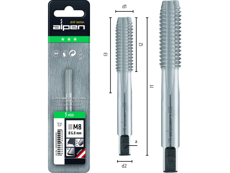 ✓ Für Durchgangsgewinde, geeignet für legierte und unlegierte Stähle bis ca. 850 N/mm², Stahlguss, Temperguss, Messing, Aluminium und Kupfer.