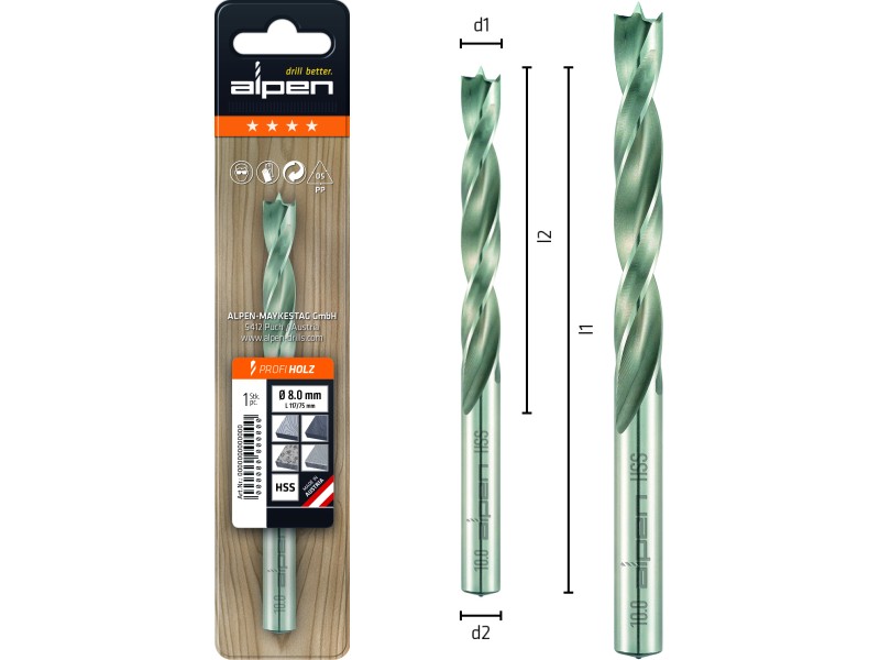 ✓ Hitzebeständig bis 450° C. Zum Bohren von Weich- und Harthölzern, Spanplatten, Hartfaserplatten, zum Dübellochbohren.