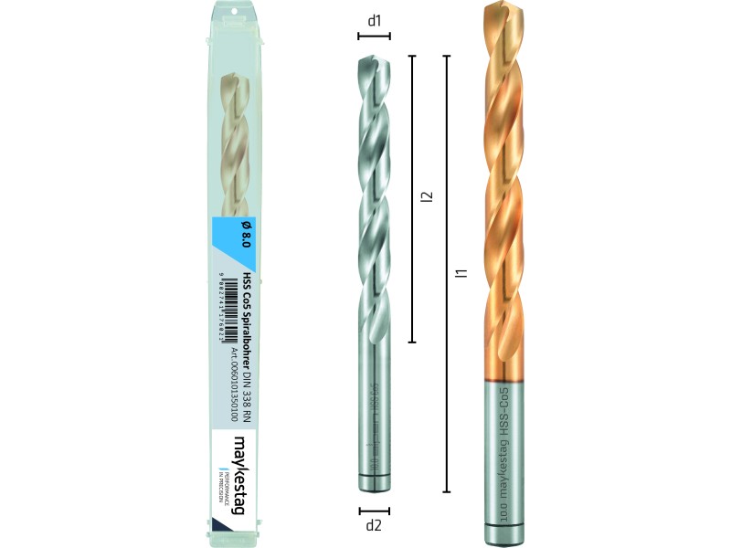 ✓ 5% kobaltlegierter Spiralbohrer mit sehr hoher thermischer Belastbarkeit zum Bohren von Werkstoffen mit höherem Legierungsgehalt und Festigkeit über 800 N/mm2.