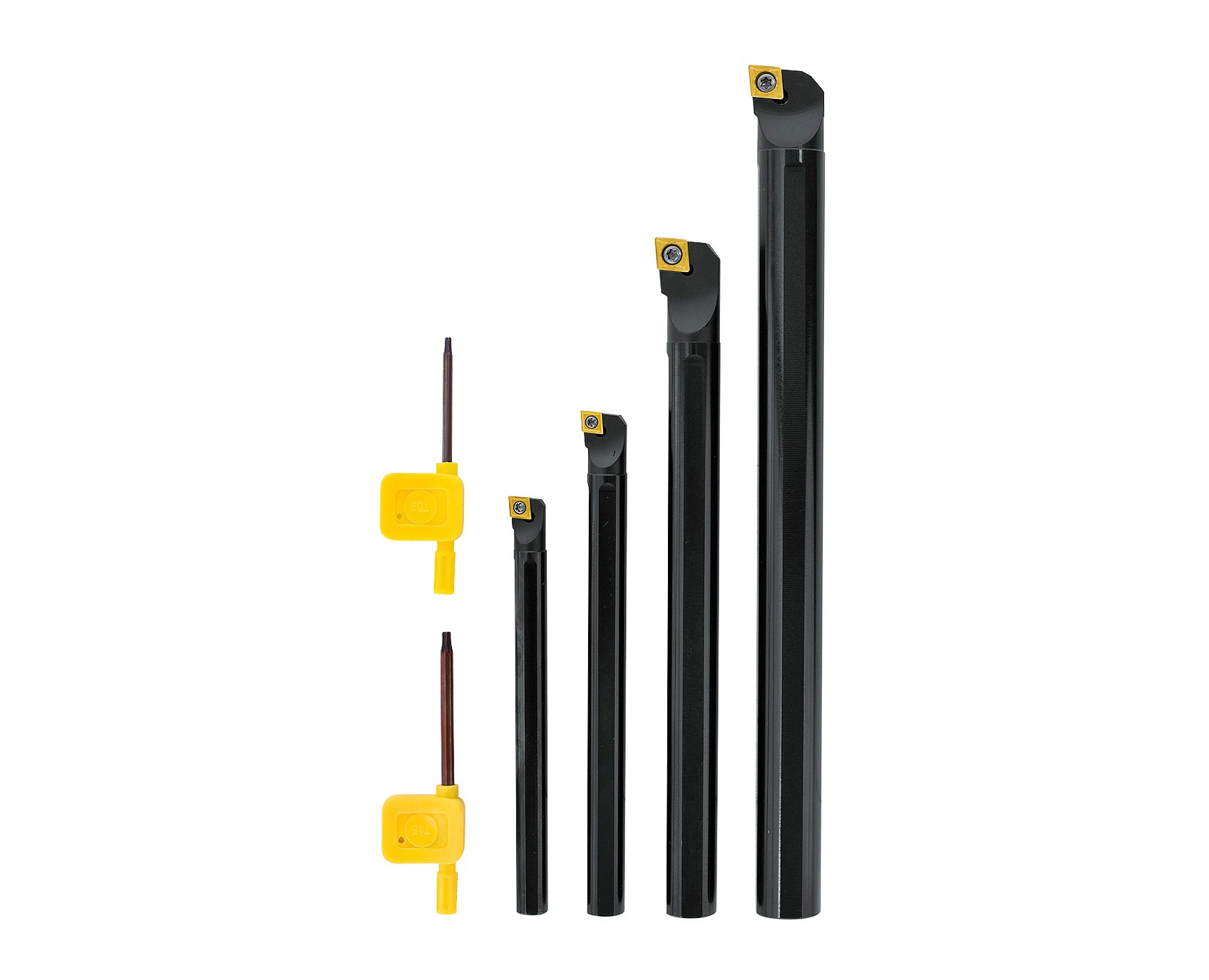 Dieses 4-teilige Produkt verfügt über einen Schaft in den Größen 10, 12, 16 und 20 mm und ist mit TiN-beschichteten HM-Wendeschneidplatten ausgestattet.
