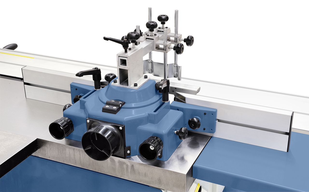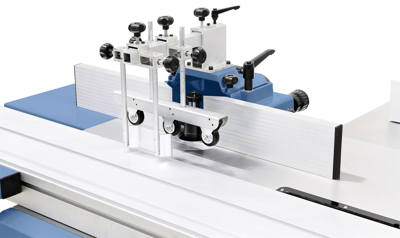 • Robuste Fräserschutzhaube mit feineinstellbaren Aluminium-Anschlagschienen