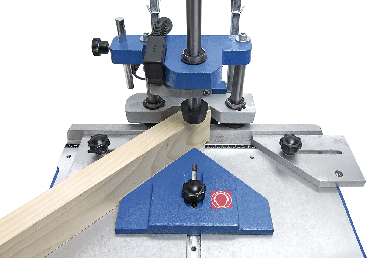 • Funktionsweise: Beim Herunterdrücken des Hebels wird das Werkstück geklemmt und die Fräser verfahren bis zur voreingestellten Frästiefe. Beim Hochheben des Hebels in die Ausgangsposition wird das gefräste Werkstück freigegeben und der Motor schaltet automatisch ab