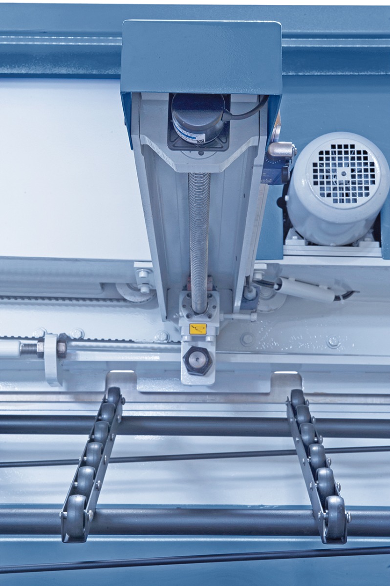 - Motorischer Hinteranschlag, präzises Verfahren über Kugelumlaufspindeln
