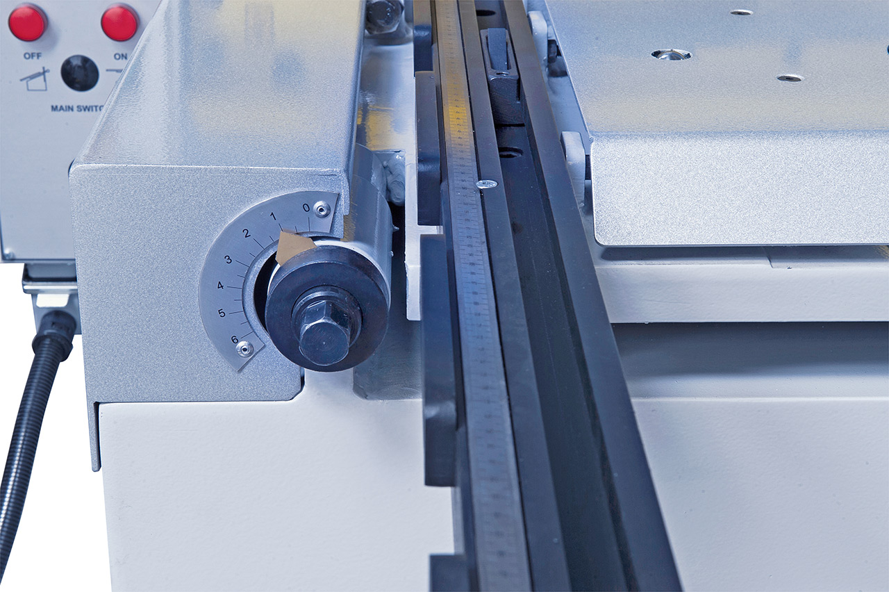 - Auflagetisch mit rechtwinkeligem Anschlag mit Skala, Kippnocke und T-Nut für den optionalen Winkelanschlag