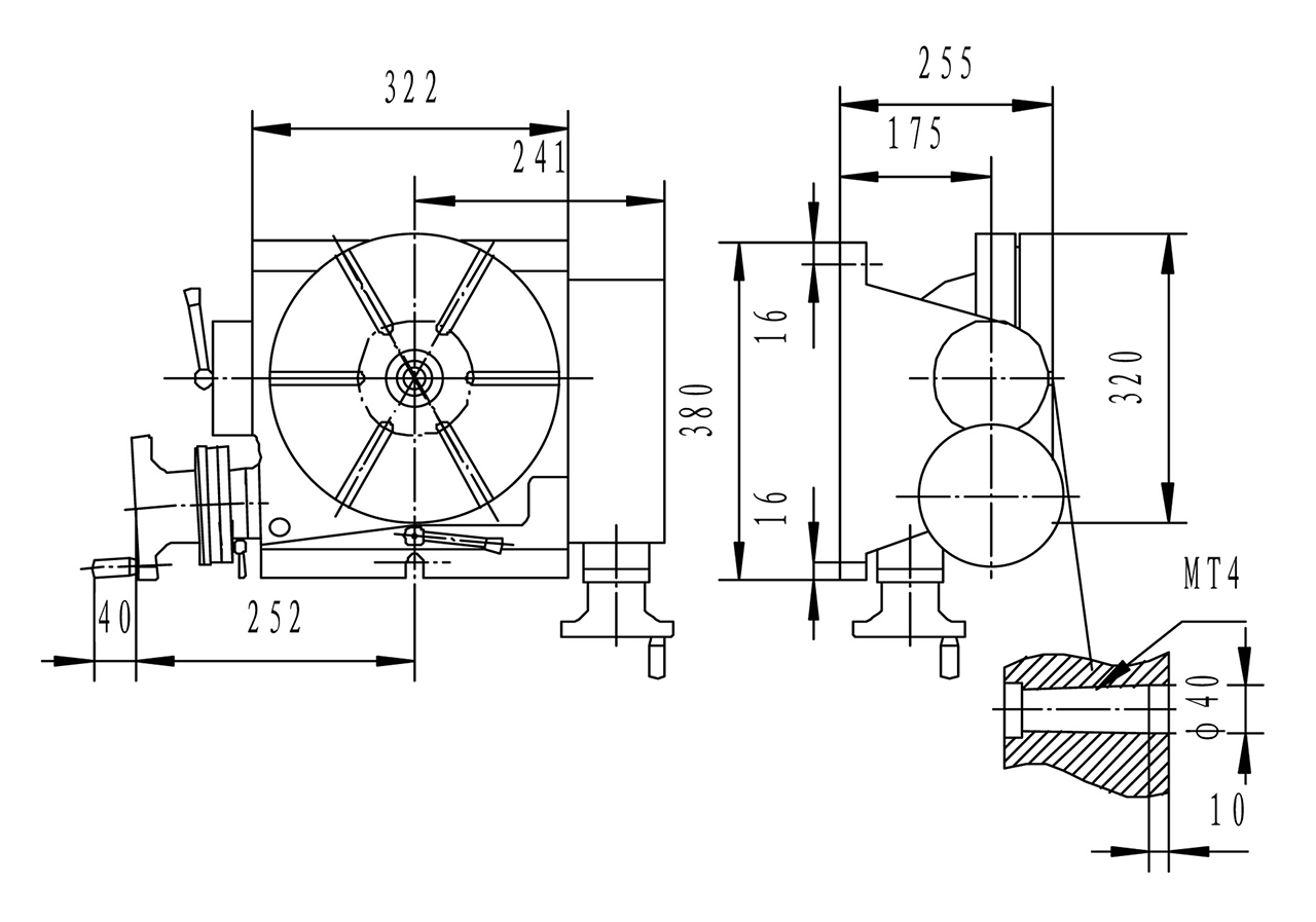 Dieses Produkt hat einen Tischdurchmesser von 320 mm, eine Bohrung MK 4, T-Nutenbreite von 14 mm mit 6 T-Nuten und eine Übersetzung von 90:1. Es kann horizontal bis zu 250 kg und vertikal bis zu 125 kg tragen. Das Gewicht beträgt etwa 135 kg.