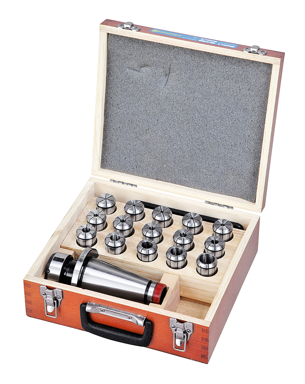 Dieses Produkt bietet einen ER40 Typ mit ISO 50 Kegel und einem Spannbereich von 3 – 25 mm, inklusive 15 Spannzangen mit verschiedenen Größen von 3 mm bis 25 mm.