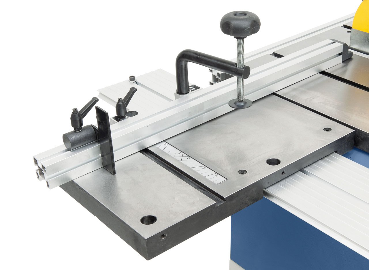 • Massiver Graugusstisch mit T-Nutführung für Sägearbeiten mit dem Gehrungsanschlag links und rechts vom Sägeblatt