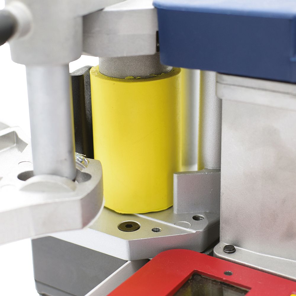 Das Klebeband wird präzise durch einen einstellbaren Breitenmesser (Auflösung 1 mm) geführt, der eine genaue und problemlose Führung des Klebebandes zum zylindrischen Klebebandaufleger ermöglicht. Zwei gummierte, ergonomische Griffe ermöglichen die präzise Führung der Maschine entlang des Werkstücks. Der Auflagetisch ist mit einer speziellen Gleitschicht versehen, die einen einfacheren Vorschub ohne Kratzer auf dem Werkstück ermöglicht. Er ist außerdem mit einer Skala zur präzisen Einstellung der Werkstückdicke ausgestattet und befindet sich in einer stabilen Halterung mit der Möglichkeit einer Neigung von +/-15°, die ein präzises Kantenanleimen von abgeschrägten Oberflächen ermöglicht. Der Deckelgriff kann je nach Art der Anleimung in zwei Positionen gebracht werden.