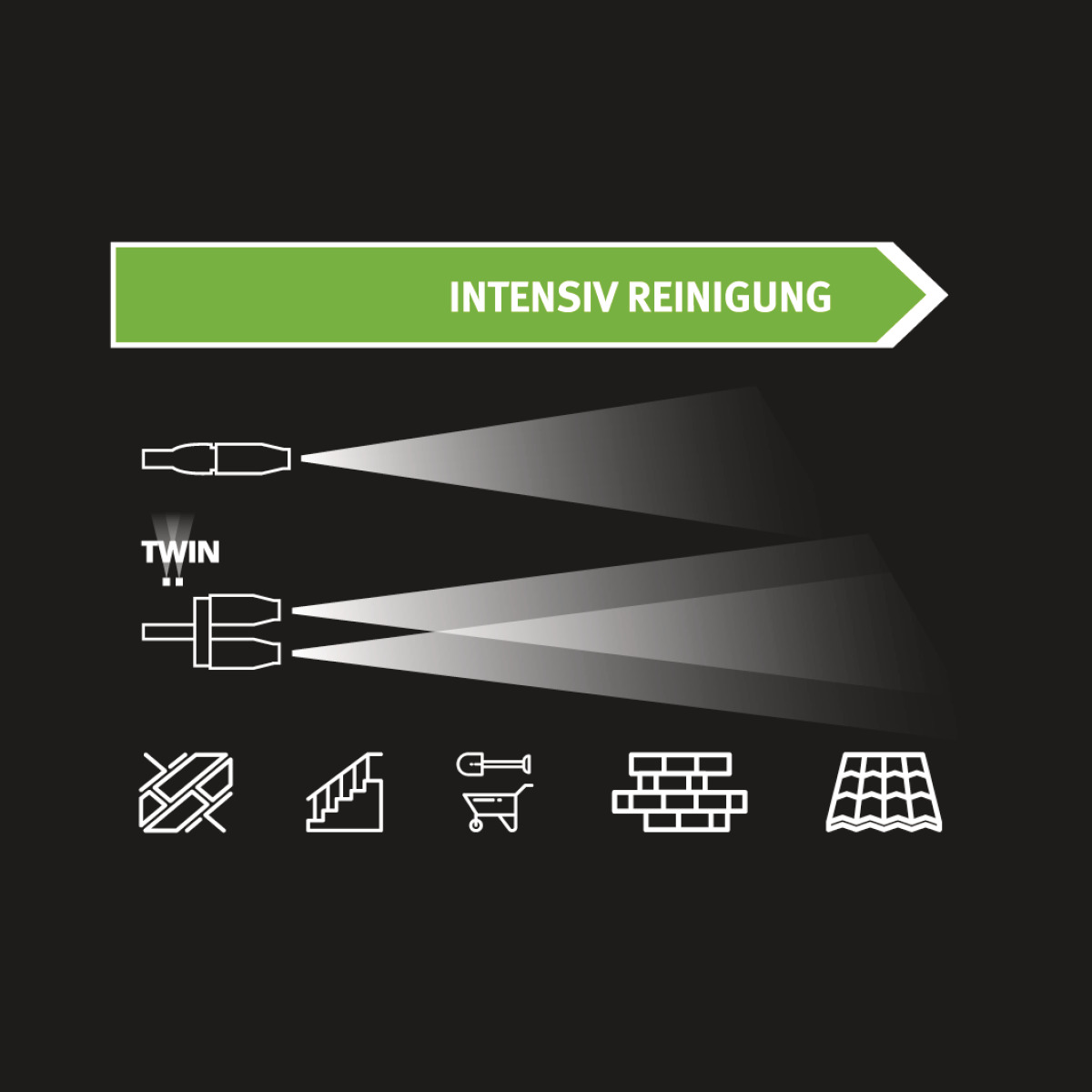 MAX Modus: Für hohe Reinigungskraft, um hartnäckige Verschmutzungen zu entfernen. Speziell für die Bearbeitung von Stein-, Beton- oder Ziegeloberflächen oder für die effektive Reinigung von Metallgeländern und -toren, Kraftfahrzeugen sowie Heimwerker- und Gartengeräten konzipiert.