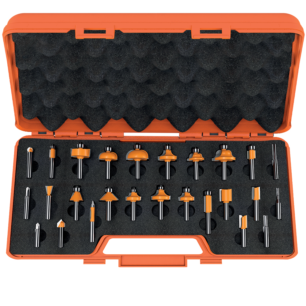 Die Werkzeugauswahl umfasst die meistgefragten Nutfräser, Bündigfräser, Zinkenfräser, Hohlkehlfräser, Karniesfräser, Falzfräser, Abrundfräser sowie andere häufig gebrauchte Fräser. Die Fräser stellen 2mm-starkes Hartmetall und rückschlagarmes Design dar und sind mit der orangefarbigen P.T.F.E.-Antihaftbeschichtung beschichtet.