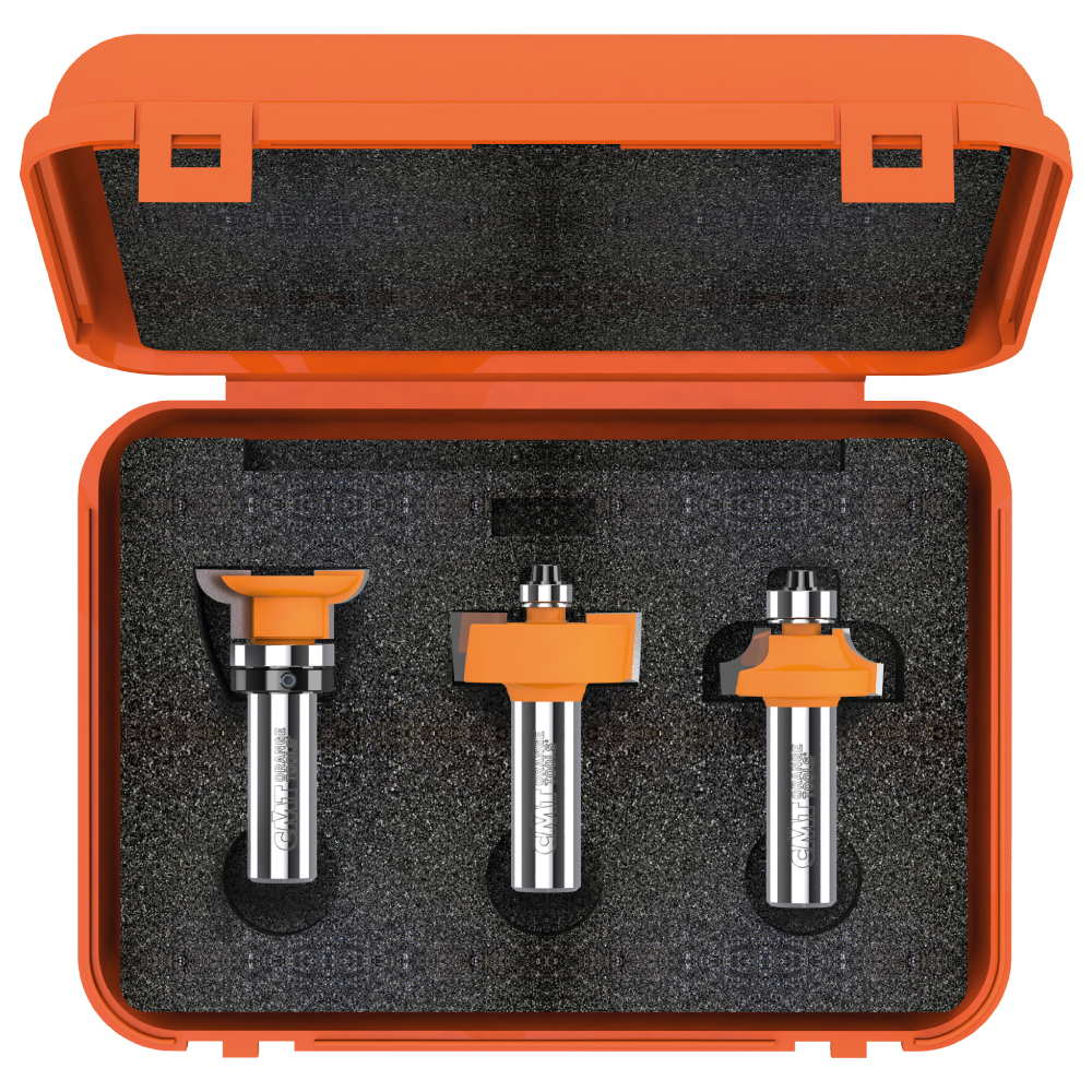 Stellen Sie mit diesen 3-teiligen Fräsersets Glastüren für anspruchsvolle Möbel her. Die Sets bestehen aus einem Abplattfräser zum Fräsen eines dekorativen Viertelstabprofils in den Rahmen, einem Profil-/ Konterprofilfräser, welcher das Profil am Ende der Leiste formt, sowie einem Falzfräser für das Einlassen des Glases. Durch das Kugellager der Fräser können Sie auch geschwungene Rahmen herstellen.