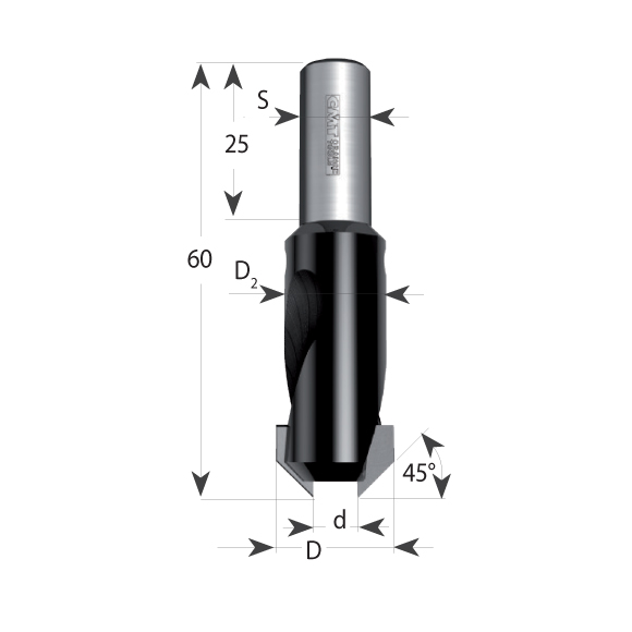 Startseite » Shop » CMT 45°-Senker HW mit Zylinderschaft – d=5 D15 a=45° S=10X25 R