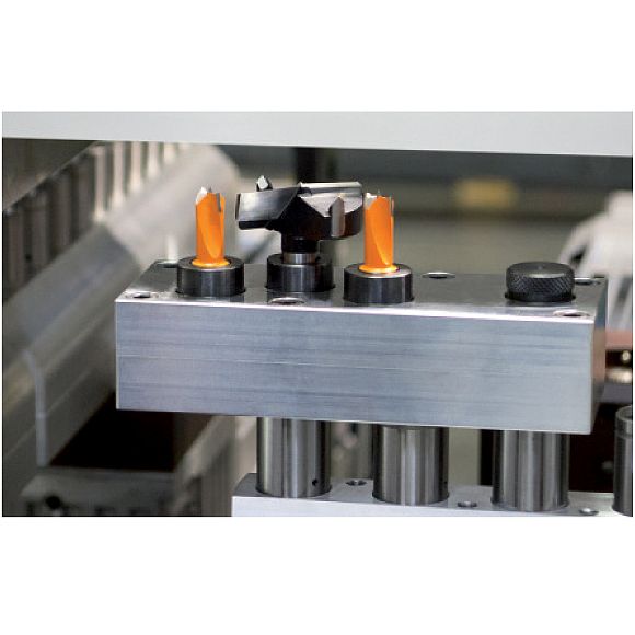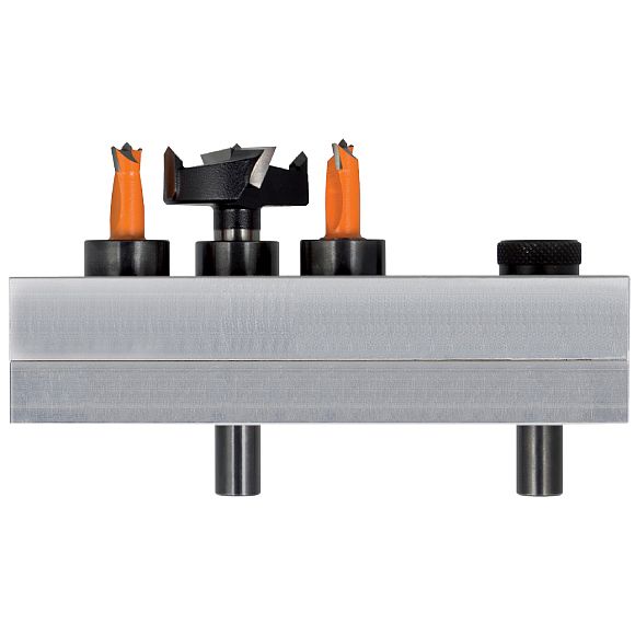 Neuer Bohrkopf mit drei Spindeln zum Einspannen des Forstnerbohrers und zwei Dübelbohrern für Scharniere Typ Blum, Salice, Häfele und Hettich mit einer Teilung von 45 / 9,5 mm. Für das Einspannen in Düblern und laufenden Dübelmaschinen.