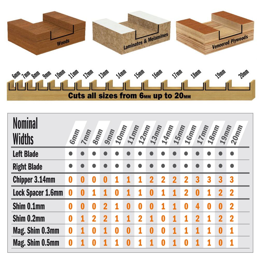 Startseite » Shop » CMT Nutscheibe im Set DADO PRO – D203x6,2-20 d15,87 Z12 HW