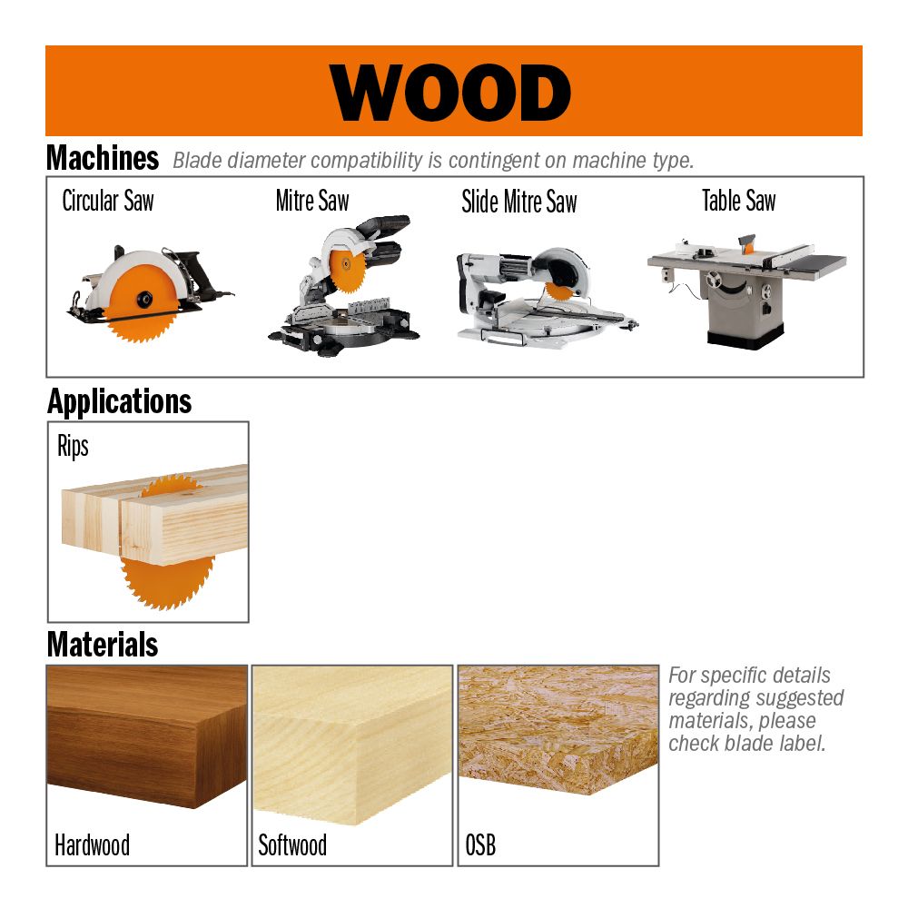 Sägeblatt mit wechselseitig geneigten Hartmetallzähnen HW für Längsschnitte in Hart- und Weichholz. Die Teflon-Oberfläche der Orange Shield Coating-Scheibe bietet einen hohen Korrosionsschutz, verhindert das Anhaften von Sägemehl und Harz an der Scheibe und leitet die Wärme besser ab. Zahn mit Spänebegrenzer verhindert Rückschlag. Dehnungsrillen garantieren einen geraden Schnitt.
