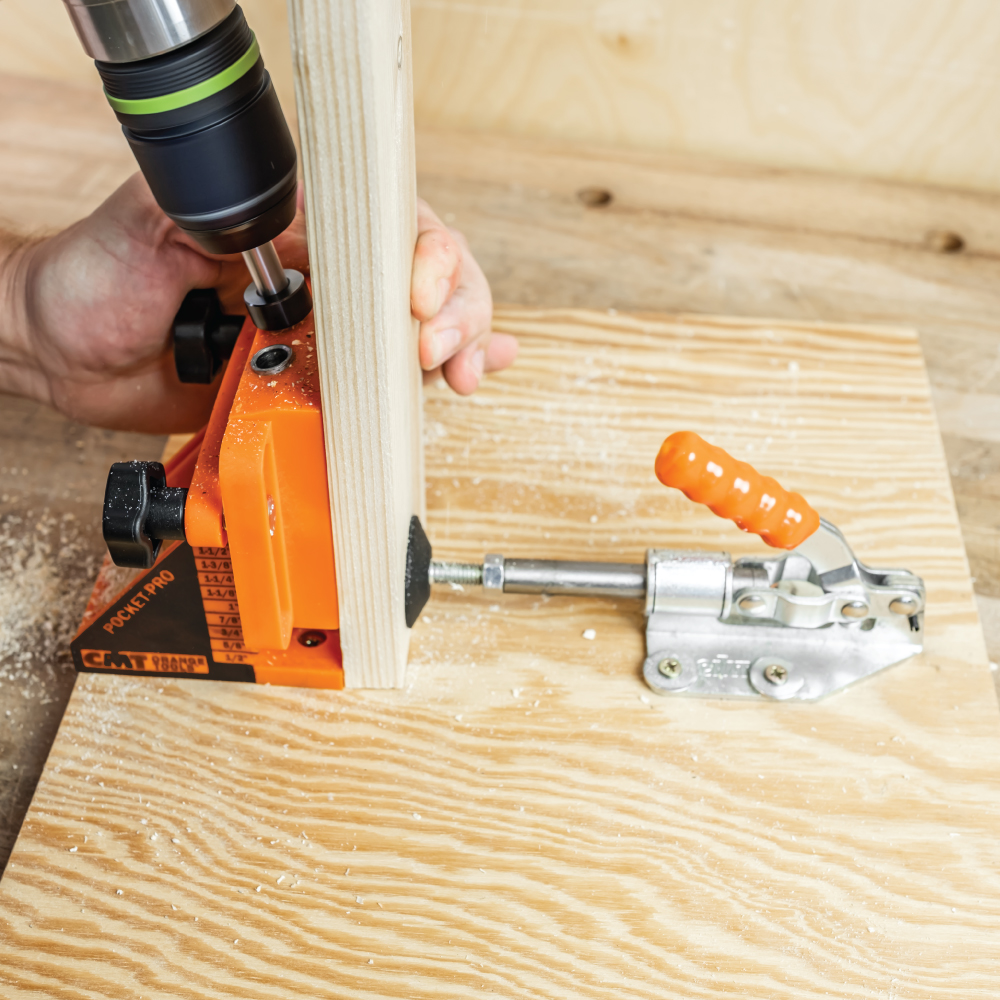 • Manche Produkte verlangen den Zusatz oder den Ersatz von einigen Teilen zur Bearbeitung verschiedener Stärken. Nicht mit der PocketPro™-Bohrhilfe, welche Verbindungen mit Stärken zwischen 12,7mm und 41,3mm ermöglicht, indem Sie einfach das System vertikal einstellen.