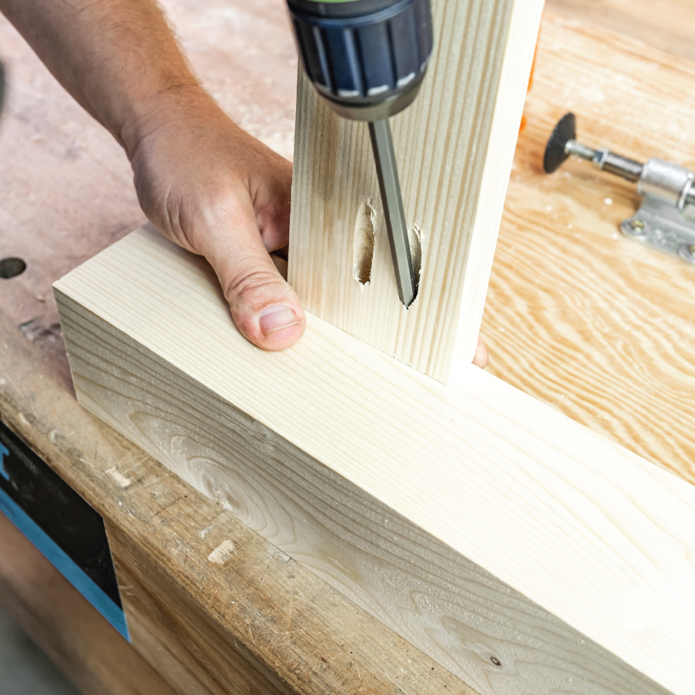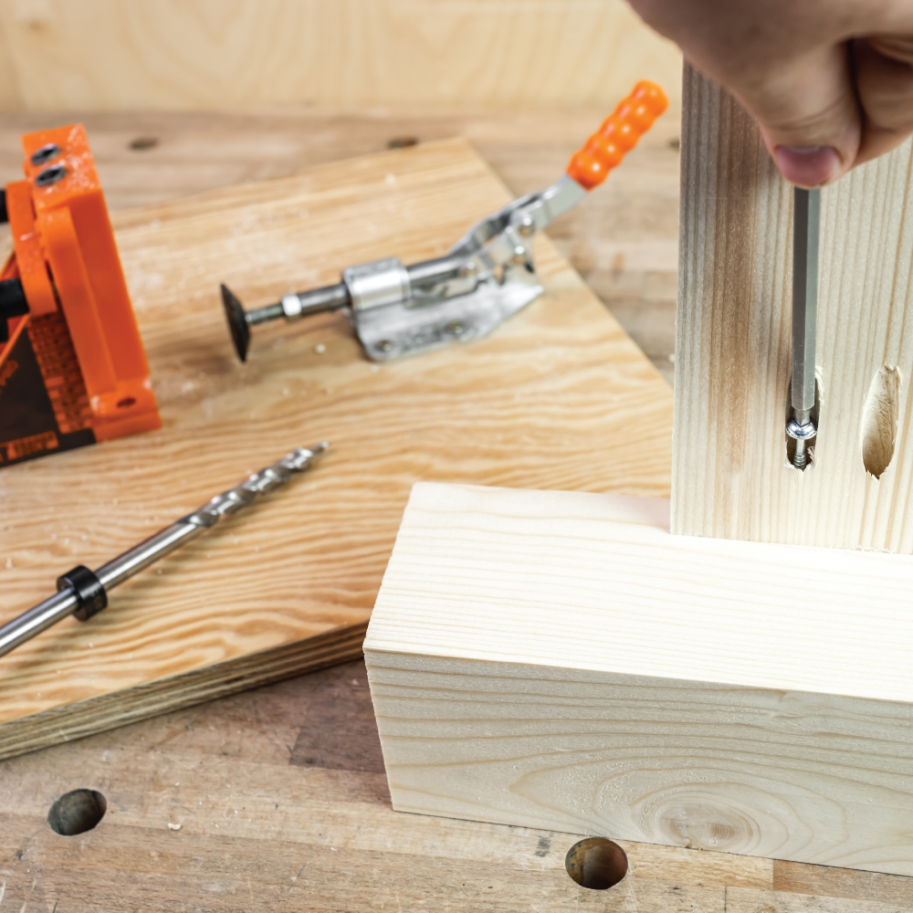• Mit der Pocket-Pro-Bohrhilfe können Sie die Lage der Löcher im Vergleich zum Ende Ihres Werkstücks verstellen, um stärkere Verbindungen anzufertigen, indem Sie längere Schrauben benutzen.
