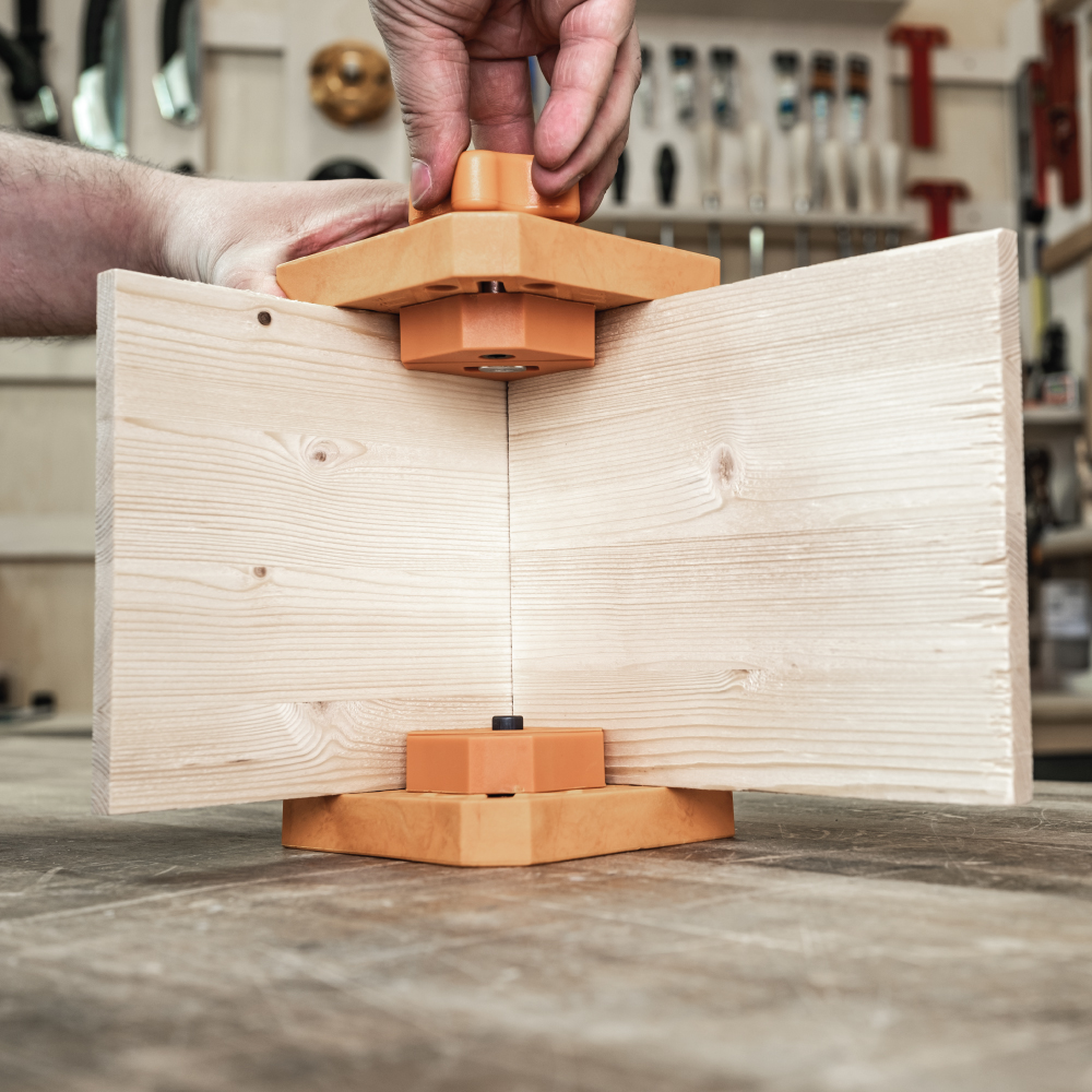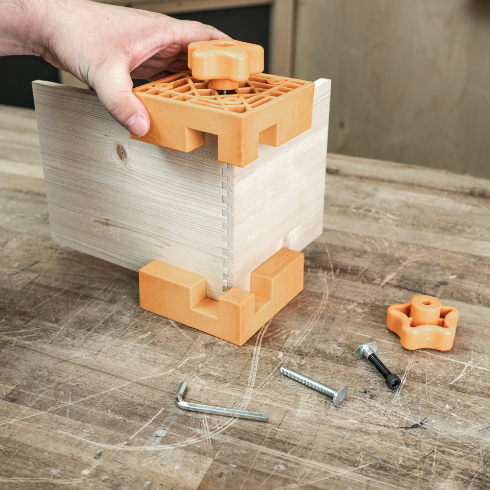 Mit diesen Klemmen haben Sie beide Hände frei, um Ihr Werkstück optimal zu kleben, zu nageln, zu schrauben und zu dübeln. Dank des völlig offenen Designs können Sie die Werkstücke je nach Bedarf von innen (Sechskantschlüssel) oder von außen (Knopf) befestigen. Wenn Sie den Knopf / die Schraube festziehen, üben Sie den gleichen Druck auf beide Seiten der Ecke aus und dies stellt sicher, dass Sie eine perfekte 90 ° -Verbindung erhalten.