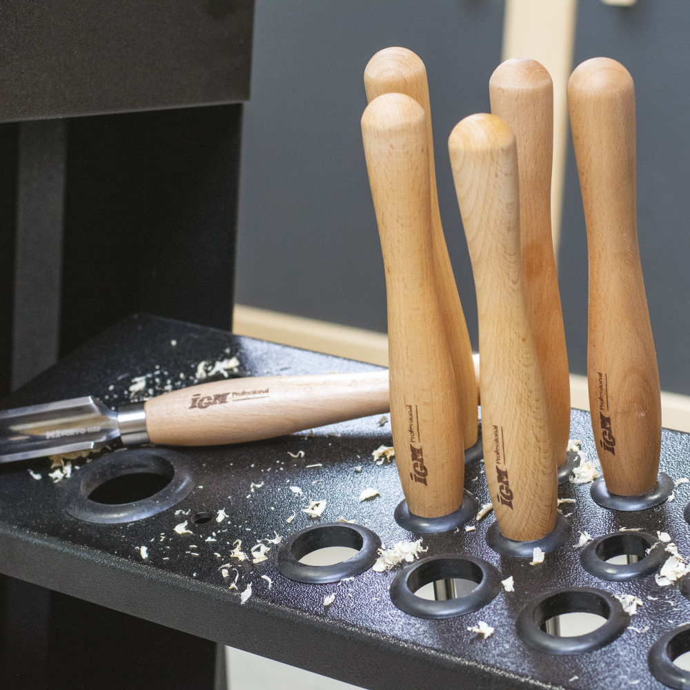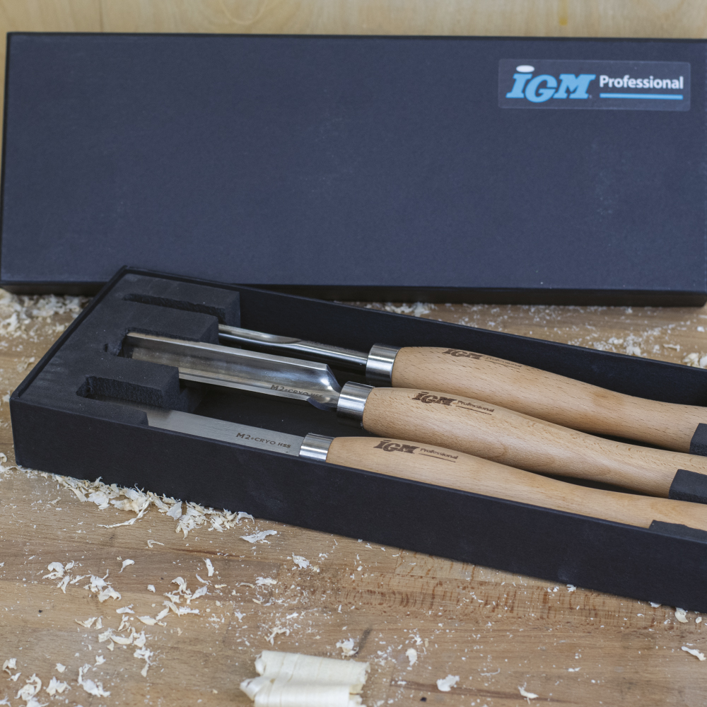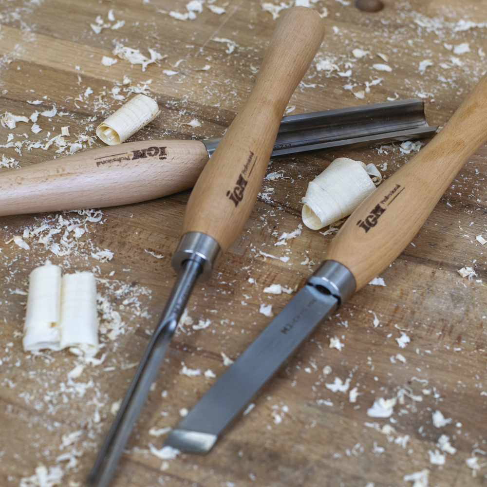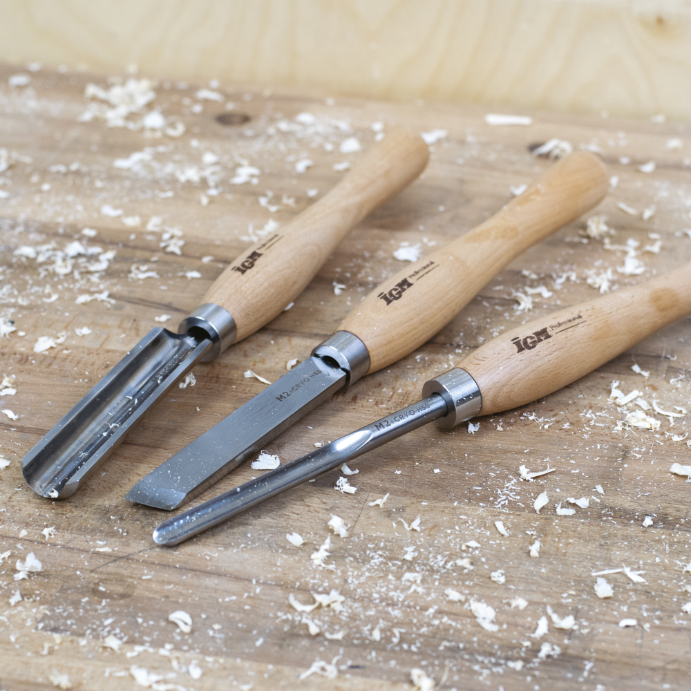 Das IGM Cryo Cryo Drechselmesser-Set enthält 3 Arten von Meißeln – von Flachmeißel (Anschliff schräg), Schruppröhre und Formröhre. Der Flachmeißel (Anschliff schräg) wird zum Erstellen von Nuten, feinen Details und zum Abschneiden von Material verwendet. Für ein rundes Werkstück oder für große Materialabtrag Der Formröhrenmeißel eignet sich auch zum Schruppen oder Erstellen von Schrägen, Rillen und anderen Details.