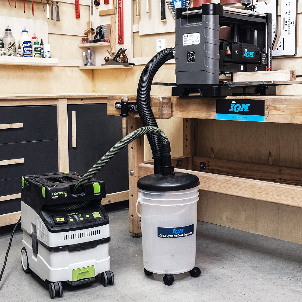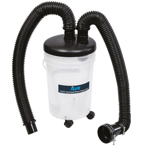 Der Staubabscheider IGM CS63 trennt Holzspäne, Sägemehl und Staub in den Abfallbehälter und reduziert dadurch Schäden am Staubabscheider, verlängert die Lebensdauer der Filter und spart Kosten für Abfallbeutel für den Staubabscheider. Der Staubabscheider verbindet Ihren Staubsauger mit Elektrowerkzeugen oder Frästisch, oder Sie können beim Reinigen Ihrer Werkstatt nur den Staubabscheider verwenden. Dank des einfachen Designs befestigen Sie einfach den Winkel an der Unterseite des Deckels und setzen ihn auf den Abfallbehälter. Dadurch wird der Behälter verschlossen und beim Einschalten des Staubsaugers entsteht darin ein Vakuum, das dazu führt, dass sich der Großteil des aufgesaugten Mülls im Behälter absetzt.