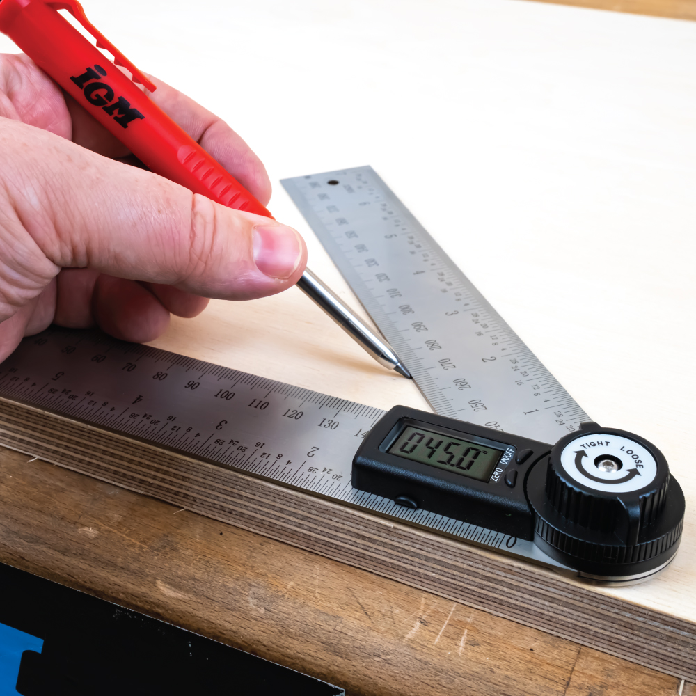 Der digitale Winkelmesser von IGM ist ein zuverlässiges Messwerkzeug für jeden Handwerker. Einfaches Einstellen von Gehrungswinkeln, präzises Zeichnen von geraden oder schrägen Linien und exaktes Übertragen von Winkeln zwischen Werkstücken. Die zwei intuitiven Tasten steuern alle Hauptfunktionen, einschließlich Nullstellung in beliebiger Position. Das Display aktiviert sich automatisch bei Armbewegung und ist sofort einsatzbereit. Geeignet für Tischler, Zimmerer und Heimwerker. Kompakte Größe sorgt für einfache Einhandbedienung und ideale Manövrierbarkeit in engen Bereichen.