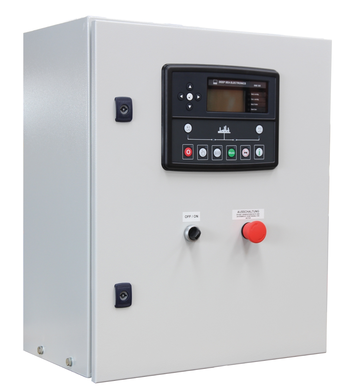 mit autom. Spannungsumschaltung bei Netzausfall, Schaltschrank zur Wandmontage, inkl. DC-Spannungsversorgung DSE 160 (Für Geräte mit Aggregatesteuerung mit Start-Stopp über potential freien Kontakt zB. DSE 3110,7310,7410, …)