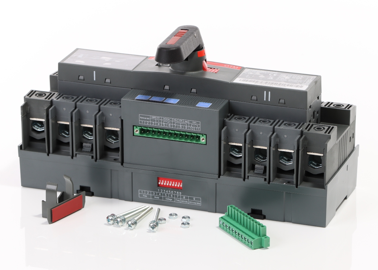Typ ABB OTM mit integrierter Netz- und Generatorüberwachung sowie Fernstartausgang für Stromerzeuger, für Hutschienenmontage, Hilfskontakte sowie Sammelschiene Abgangsseitig optional erhältlich