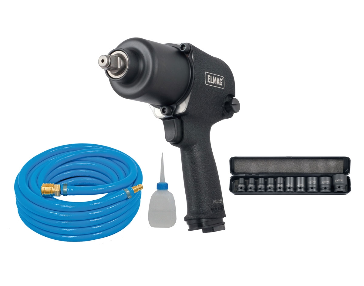 • Inkl:Druckluftschlauch-Set 'high-flex' 10m, 10×15,5mmSchlagnussen-Satz 10-tlg., SW 9-27 mmÖl für DL-Werkzeuge