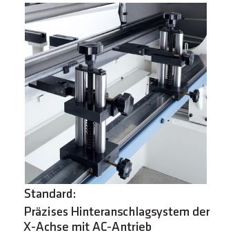 - X: CNC-gesteuerter Hinteranschlag, AC-Antrieb mit Kugelumlaufspindel, Linearführungstoleranz der Hinteranschlagfinger ± 0,01 mm