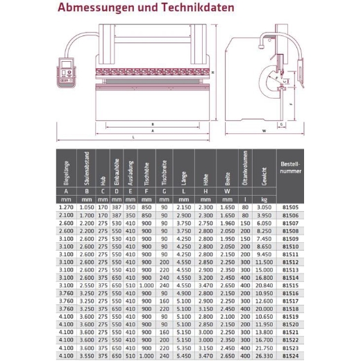 Technische Spezifikationen Elmag Hydraulische Abkantpresse 3-Achsen Mod. CNC-HAP 3100x260t