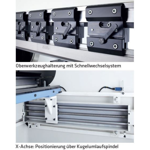 - X: CNC-gesteuerter Hinteranschlag, AC-Antrieb mit Kugelumlaufspindel, Linearführungstoleranz der Hinteranschlagfinger ± 0,01 mm
