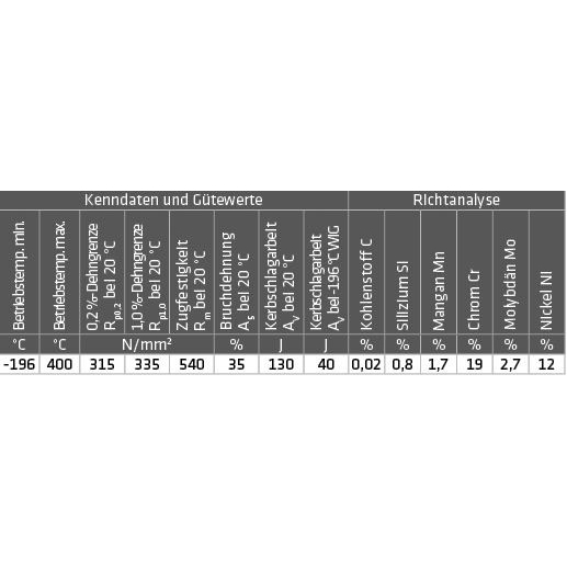 Werkstoffe: 1.4401, 1.4404, 1.4406, 1.4408, 1.4410, 1.4420, 1.4429, 1.4435, 1.4436, 1.4437, 1.4571, 1.4573, 1.4580, 1.4581, 1.4583