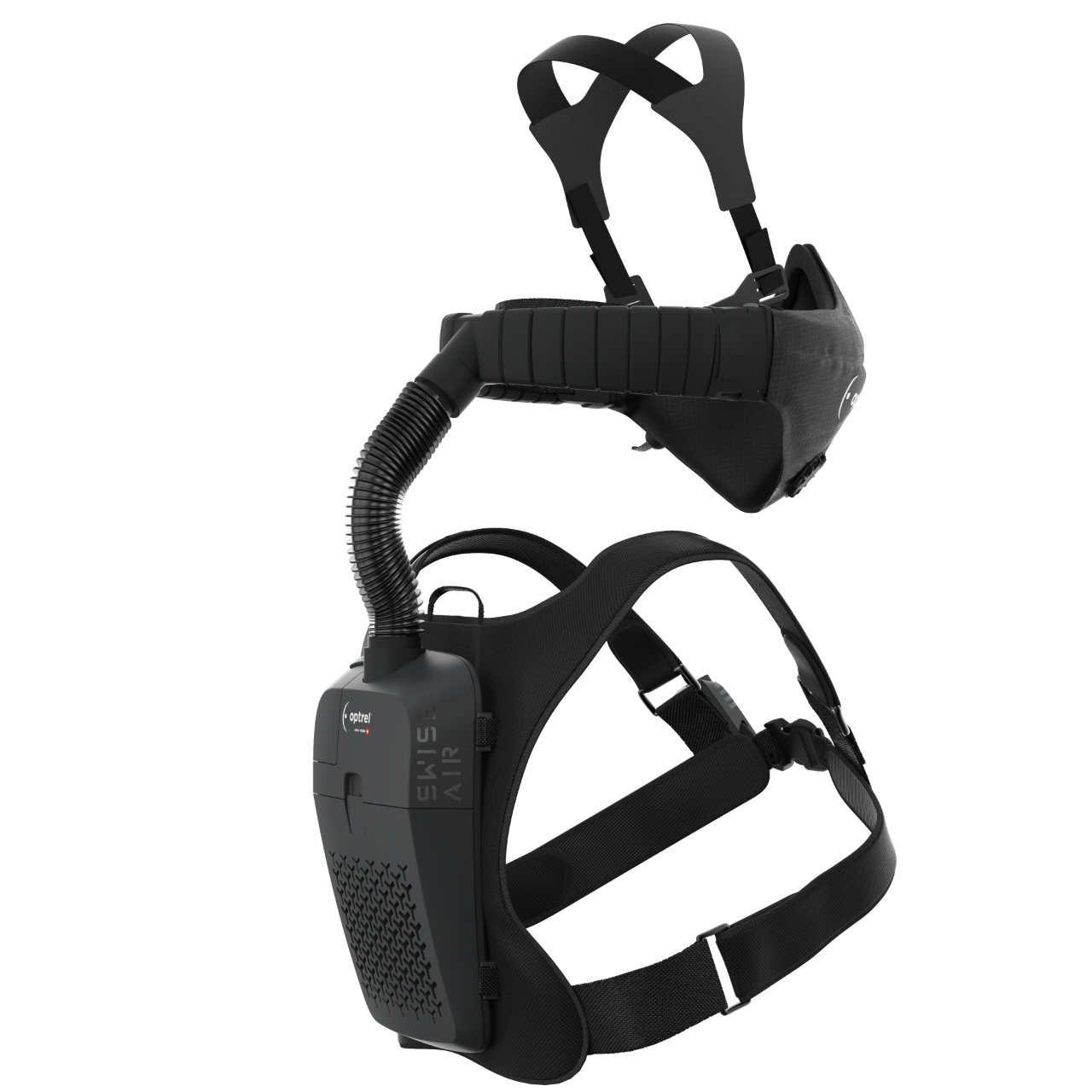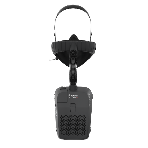 bestehend aus: Komfort-Halbmaske, Gebläseeinheit, Schlauchverbindungen, Kopf- und Nackenband, Schulter-Trageeinheit, Control Panel, Ladegerät und Optrel Rucksack, Filtertype TH3, max. Laufzeit ca. 14h