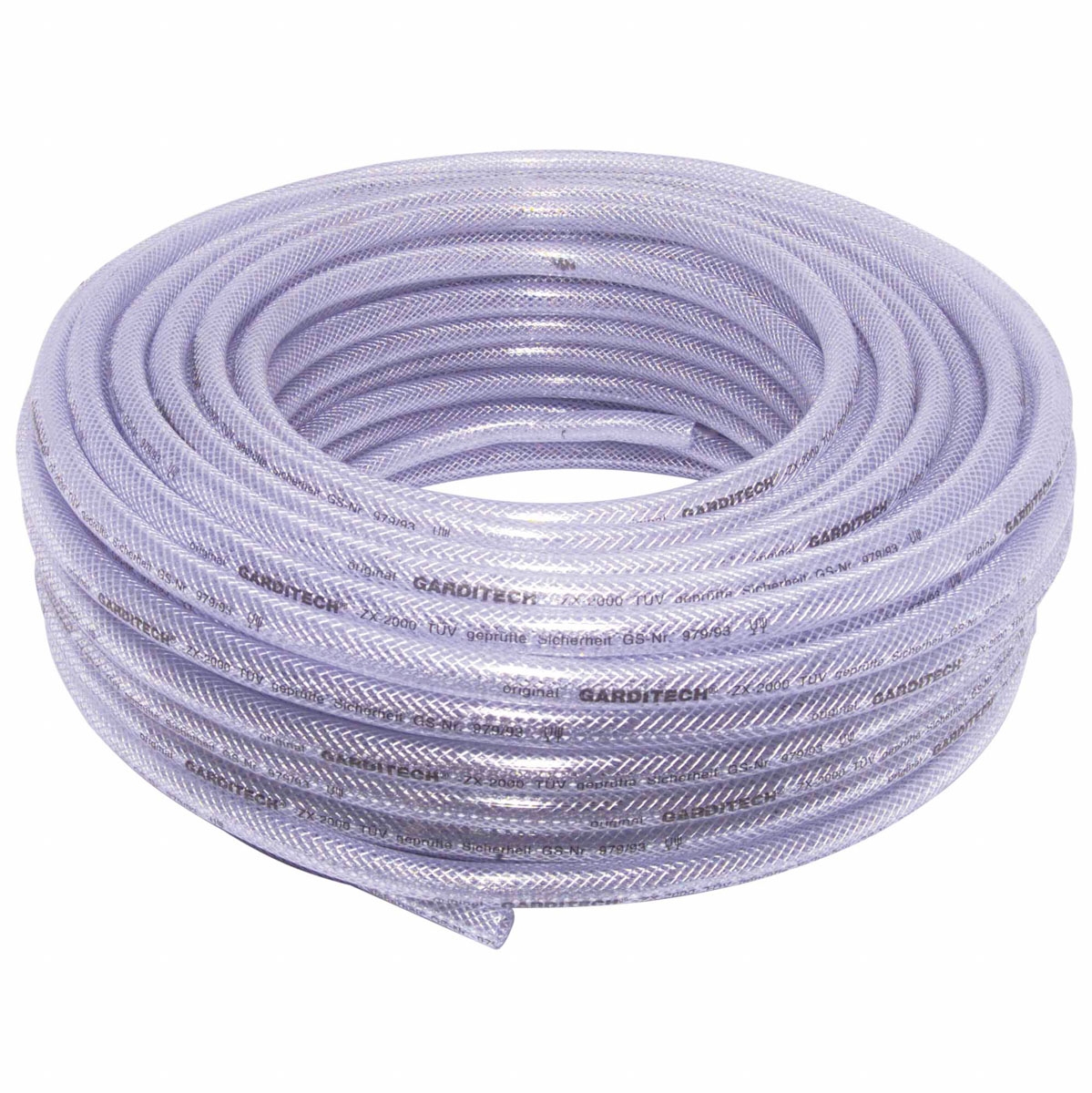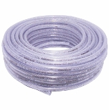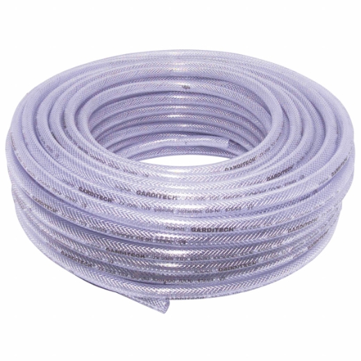 - Glasklarer (50 m Bundware) bzw. blau transparenter (Komplett-Set, 10m) PVC Schlauch mit Polyester-Kreuzgewebeeinlage