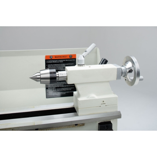 Drehfutter, festen Körnerspitzen und einem Vierfach-Stahlhalter ausgestattet. Eine Planscheibe für Drehdurchmesser bis 170 mm, eine mitlaufende Körnerspitze, ein Schnellwechsel-Stahlhalter, Lünetten und weiteres hochwertiges Drehzubehör sind optional erhältlich.