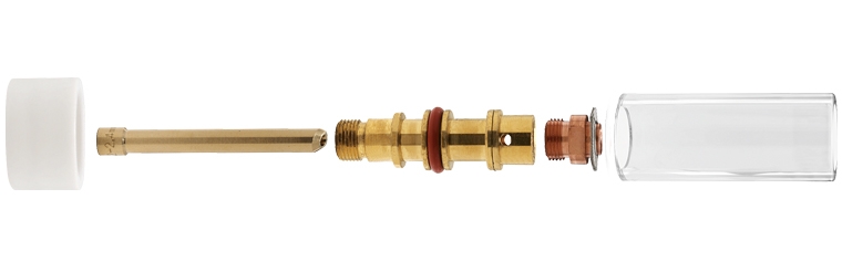 transparent, (5-teilig) 2,4 mm für SR 17/18/26,bestehend aus: Spannhülse Ø 2,4mm (TD0206-24), Isolierring (TQ0206), Spannhülsengehäuse GS 1,6-3,2 mm (TE0206-00), Gaslinse Ø 2,4mm (TE0205-24), Gashülse Pyrex GS (TC0206)