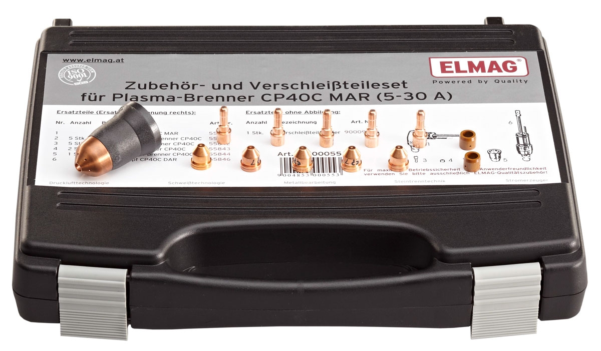 für Plasma-Brenner CP40 MAR (5-30 Amp.)zu Power Plasma 3035/M- bestehend aus:2 Stk. Diffusor CP40 (=1 Pkg./á 2 Stk.)Art. Nr. 558435 Stk. Elektrode CP40 (=1 Pkg./á 5 Stk.)Art. Nr. 558425 Stk. Düse 0,7 CP4 + 1 Stk. 0 (=1 Pkg./á 5 Stk.)Art. Nr. 558411 Stk.Düsenhalter CP40 Art. Nr. 558441 Stk.Verschleißteil-KofferArt. Nr. 9000917