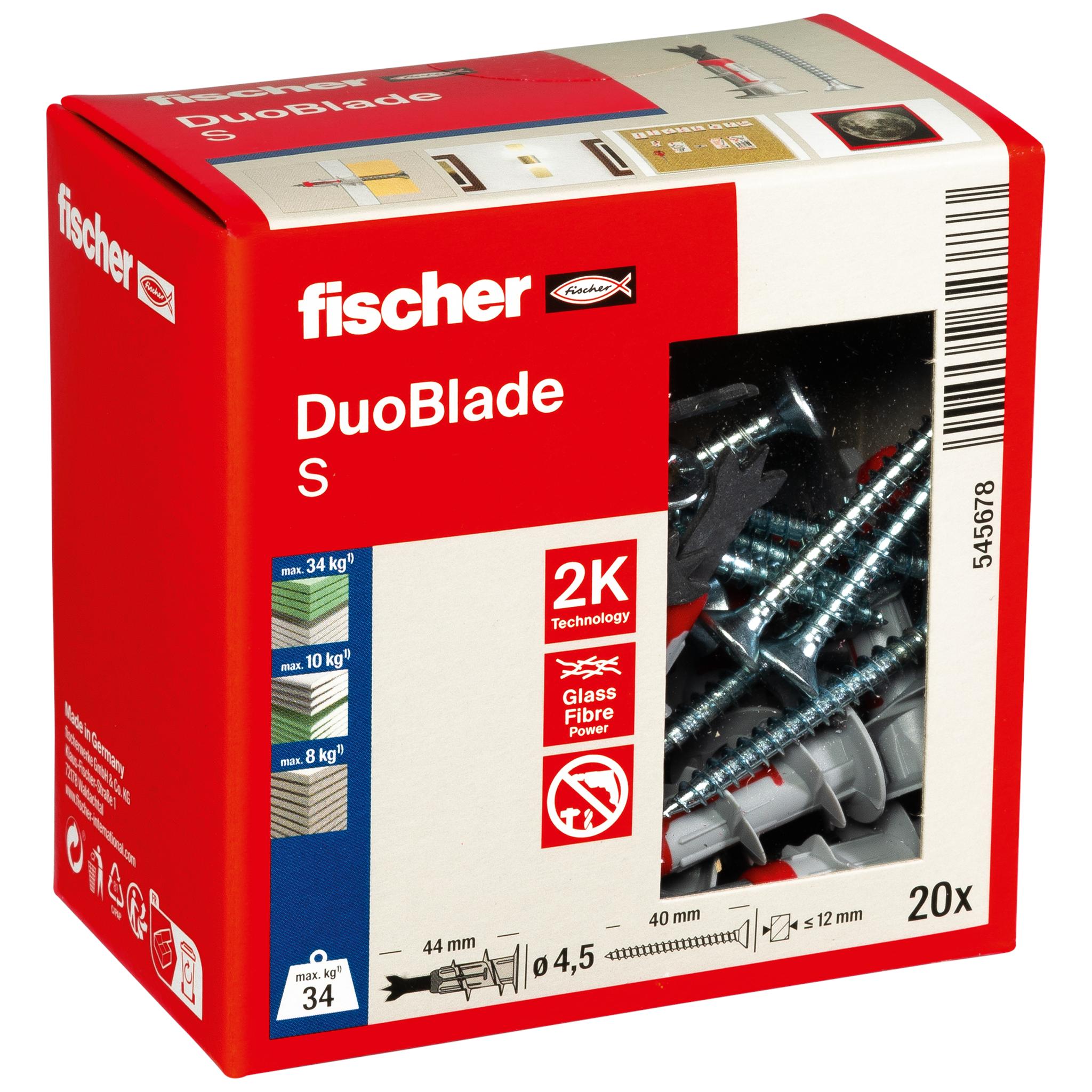 Der fischer DuoBlade ist Teil der innovativen DuoLine und besteht somit aus mehreren Komponenten für bestmögliche Performance. Die selbstbohrende Bohrspitze ermöglicht einen sauberen und effektiven Bohrvorgang. Der Dübel wird in der Vorsteckmontage mit einem Akku-Schrauber oder Schraubendreher oberflächenbündig in die Gipskartonplatten eingedreht. Der fischer DuoBlade ist abgestimmt auf Holz-, Blech- und Spanplattenschrauben von 4 bis 5 mm Stärke sowie unterschiedlichen Haken und Ösen. Dadurch ist er universell geeignet, um z.B. Rauchmelder, Vorhangstangen und Jalousien sicher und schnell zu befestigen. Der DuoBlade wird mit einem herkömmlichen PZ 2 Antrieb in die Gipskartonplatte gesetzt. Es wird kein Sonder-Setzgerät benötigt. Die selbstbohrende Bohrspitze ermöglicht einen sauberen und effektiven Bohrvorgang. Der Dübel wird in der Vorsteckmontage mit einem Akku-Schrauber oder Schraubendreher oberflächenbündig in die Gipskartonplatten eingedreht. Der fischer DuoBlade ist abgestimmt auf Holz-, Blech- und Spanplattenschrauben von 4 bis 5 mm Stärke sowie unterschiedlichen Haken und Ösen. Dadurch ist er universell geeignet, um z.B. Rauchmelder, Vorhangstangen und Jalousien sicher und schnell zu befestigen. Der DuoBlade wird mit einem herkömmlichen PZ 2 Antrieb in die Gipskartonplatte gesetzt. Es wird kein Sonder-Setzgerät benötigt.