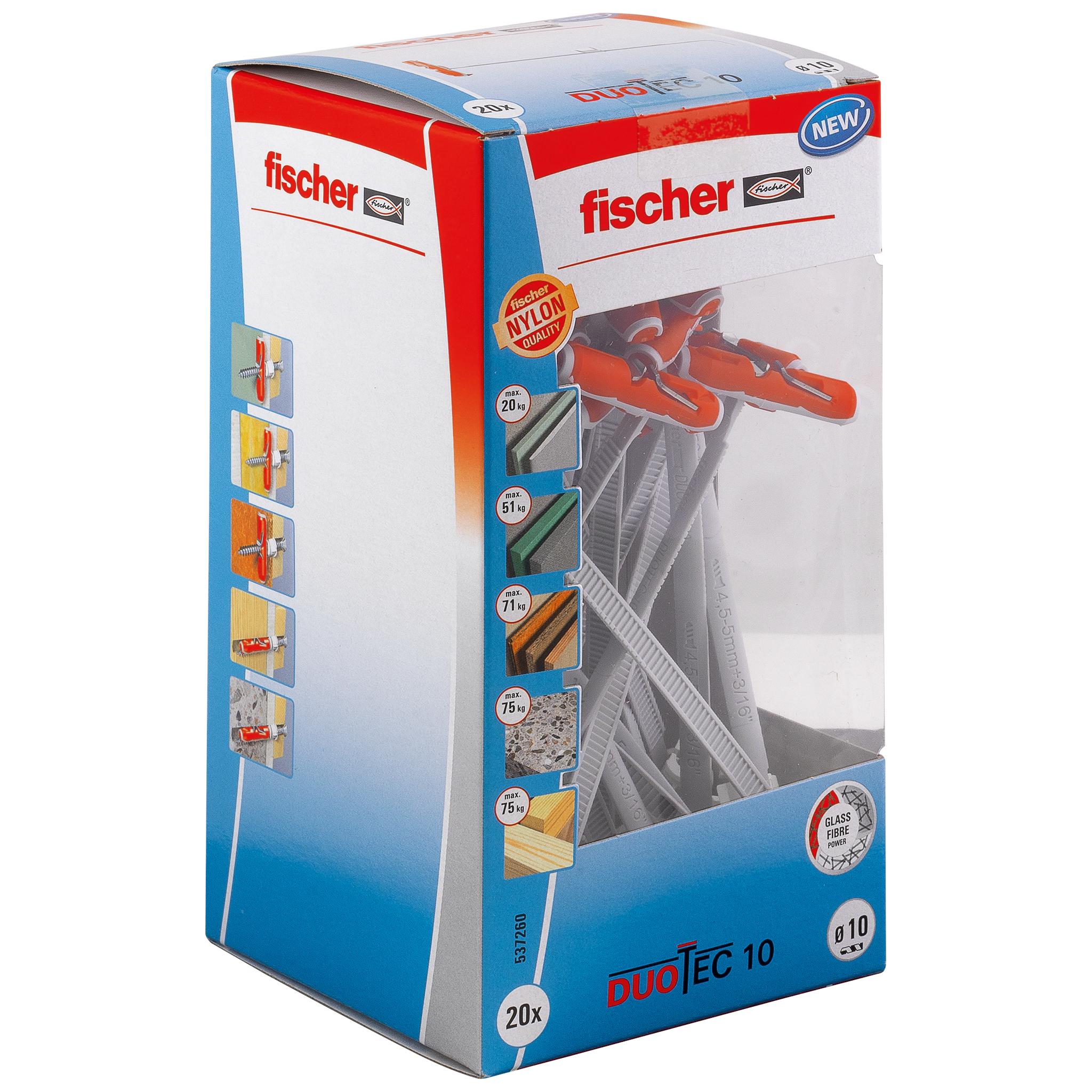 Der Nylon-Kippdübel fischer DuoTec für hohe Zug- und Querlasten durch 2 Komponenten. Einfache Montage mit geringem Bohrlochdurchmesser von 10 mm und kurzem Kippelement auch in engen und gedämmten Hohlräumen. Einfache Vormontage, der Dübel fällt auch ohne Schraube nicht in das Bohrloch. Kein Einschneiden und damit Schwächung der Gipskartonplatte. Das Kippelement klappt hinter der Platte automatisch auf und gibt ihm seine Tragkraft. Durch die flexible Schraubenaufnahme aus rostfreiem Stahl kann der Kippdübel mit Holz- und Spanplattenschrauben oder metrischen Haken- und Gewindestangen mit Kontermutter verwendet werden. Bei Bohrlochtreffern in Vollbaustoffen funktioniert er wie ein Spreizdübel.