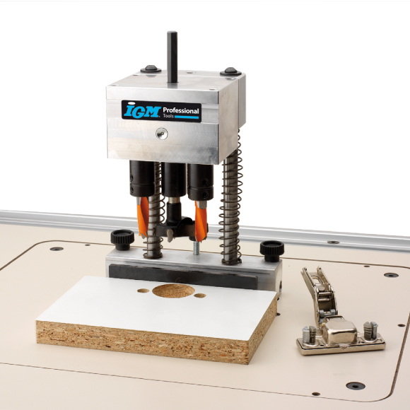 Die revolutionäre Bohreinheit besteht aus einer Trägerbasis und einem der 8 möglichen Typen von Bohrköpfen, die in die Trägerbasis montiert werden. Dadurch können Sie Löcher für Scharniere Typ Hettich, Blum, Mepla, Grass, FGV, kleine 26 mm Scharniere und Fenstergriffe bohren oder den 5-Spindel-Kopf mit 32-mm-Teilung zum Bohren von Löchern für Dübel oder Regalträger verwenden. Verwendung mit Handbohrmaschinen oder Ständerbohrmaschinen. Zur Schmierung ist das Mobil SHC100 Öl zu verwenden.