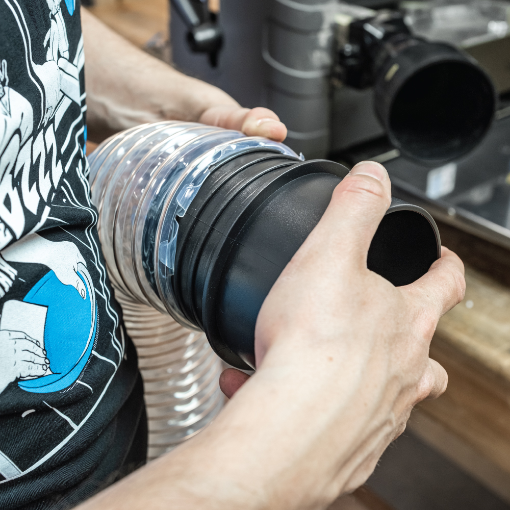 Dies ist eine leicht zu montierende, flexible Gummitülle für die Befestigung von Schläuchen an Maschinen. Das Ende hat ein geformtes Linksgewinde, das direkt auf den 100 mm Schlauch geschraubt werden kann ohne eine Manschetten verwenden zu müssen. Der Gewindeteil kann auf den Schlauch mit einem Durchmesser von 102 bis 110 mm angeschraubt werden. Wenn der Schlauch an der Tülle locker ist, stülpen Sie den Schlauch um und nun schrauben Sie die Tülle an. Die Tülle ermöglicht schnelles Anschließen, Trennen und wiederholtes Anschließen der Absauganlage von einer Maschine zur anderen. Diese Schlauchtülle passt auf alle von IGM angebotenen Schläuche bzw. auf Schläuche mit einem Durchmesser von 100mm, bei denen der Erdungsdraht im Uhrzeigersinn verdreht ist.