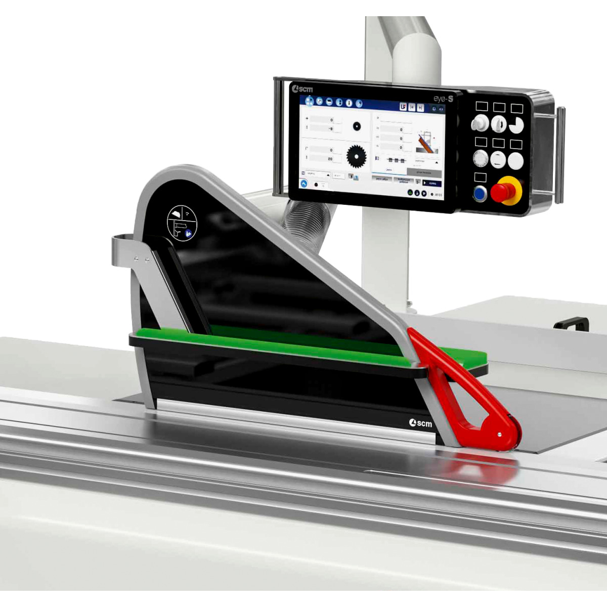 Ausstattung Vorritzaggregat: Zwei-Achs-Vorritzaggregat mit automatischer Positionierung Eloxierter Aluminium-Formatschiebeschlitten: ✔ Ein-/Aus-Schalter am Schiebeschlitten: für Motoren des Haupt-und Vorritzsägeblatts Besäumrahmen: mit winkelverstellbarem Aluminium-Teleskopanschlag Materialrolle am Besäumrahmen: ✔ Säge-Parallelanschlag: motorisch, über Bedienpanel Anschläge: Drei Längsanschläge mit integrierten Digitalanzeigen Exzenterspanner: ✔ Steuerung Sägeblatthöhe, -schwenkung und Parallelanschlag: ✔ Schwenkbares Bedienpanel oben: ✔ Tischverbreiterung: ✔ Tischverlängerung: ✔ Sägeblattpendelschutz: ✔