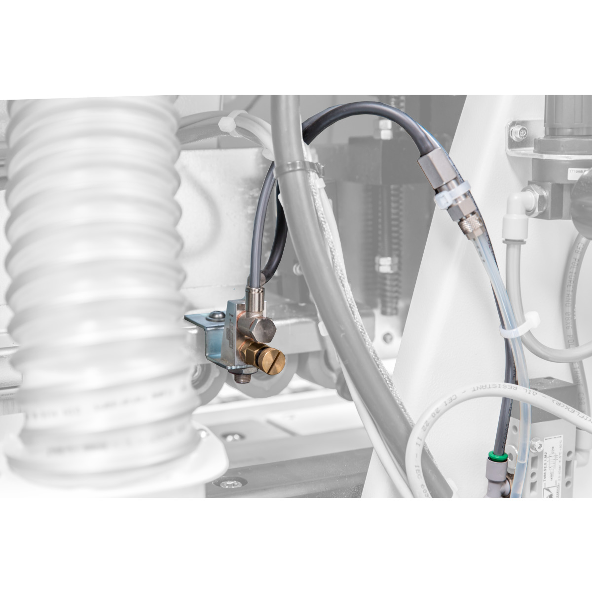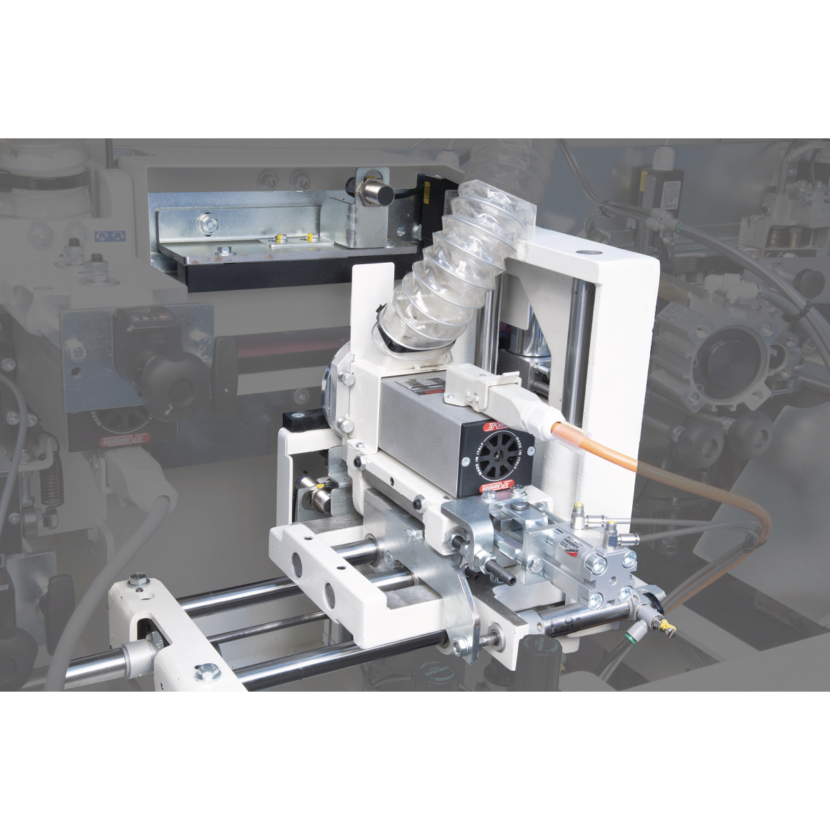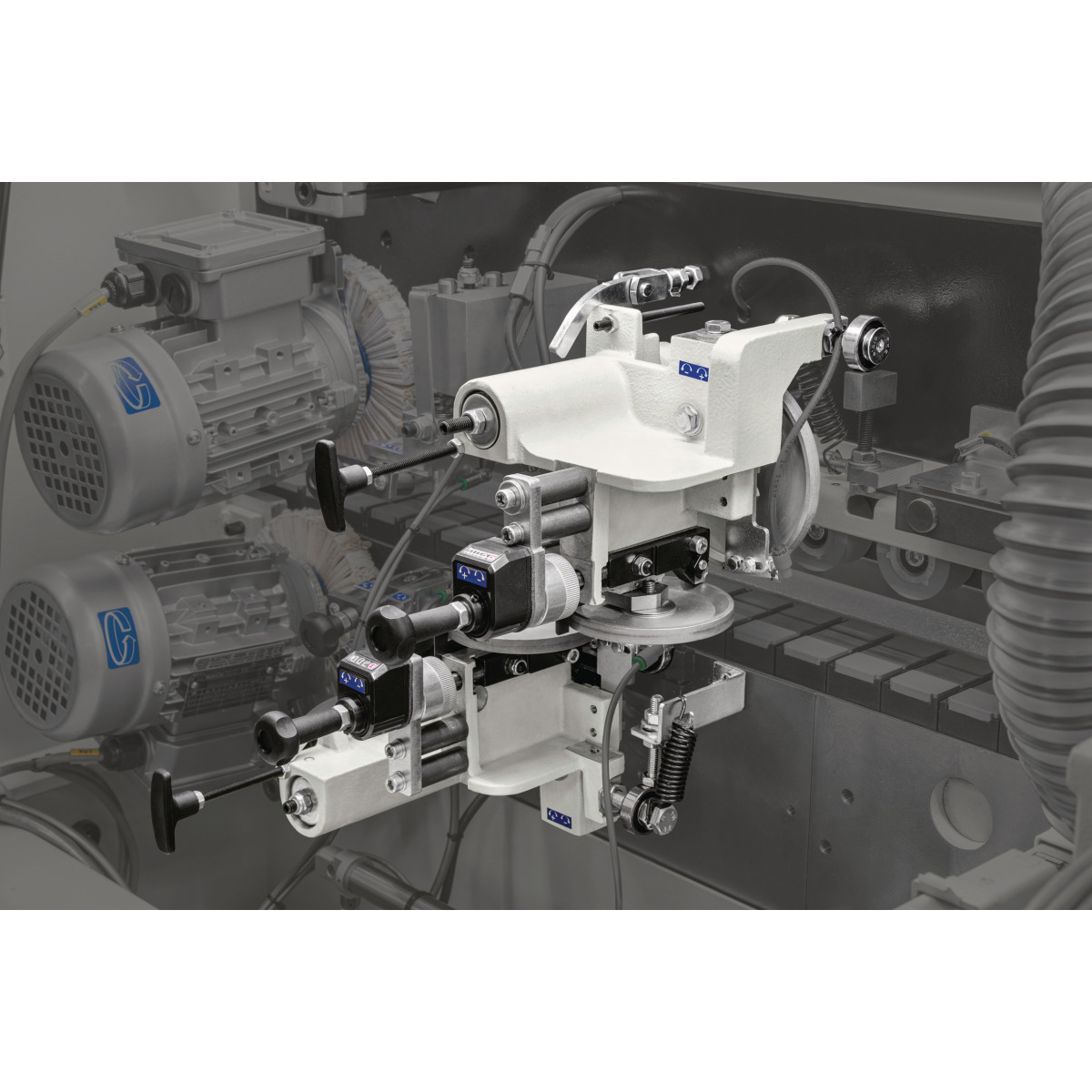 Leimbehälterschnellwechselkit: ✔ Anleimaggregat: ✔ Eckenkopieraggregat: ✔ Bündigradius-Fräsaggregat: ✔, elektropneumatisch abschaltbar