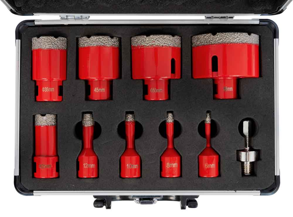 Das HOLZMANN Diamant-Trockenbohrkronen-Set 10 teilig bestehend aus 9 Bohrkronen und einen Bohrfutteradapter M14 auf Vierkant.