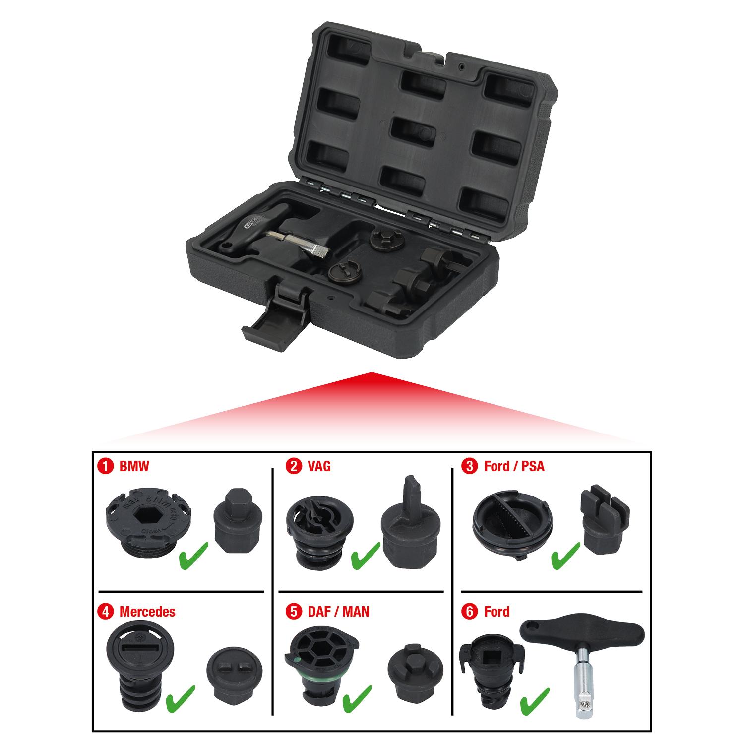 - Spezial-Bit-Stecknüsse zur Montage und Demontage der Kunststoff-Ölablassschraube an Ölwannen aus Kunststoff