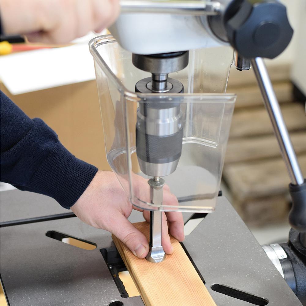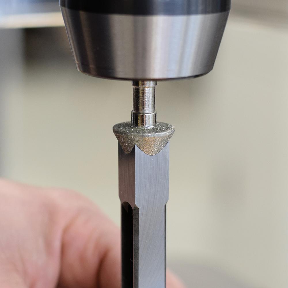 Der geschliffene Lochbohrer erhöht signifikant die Leistung Ihrer Maschine ebenso wie die Lochqualität. Wir empfehlen diesen speziell angefertigten Diamantkegelschleifer für die meisten scharfkantigen japanischen CMT- und IGM-Stemmbohrer und für Veritas-Vierkantmeißel.