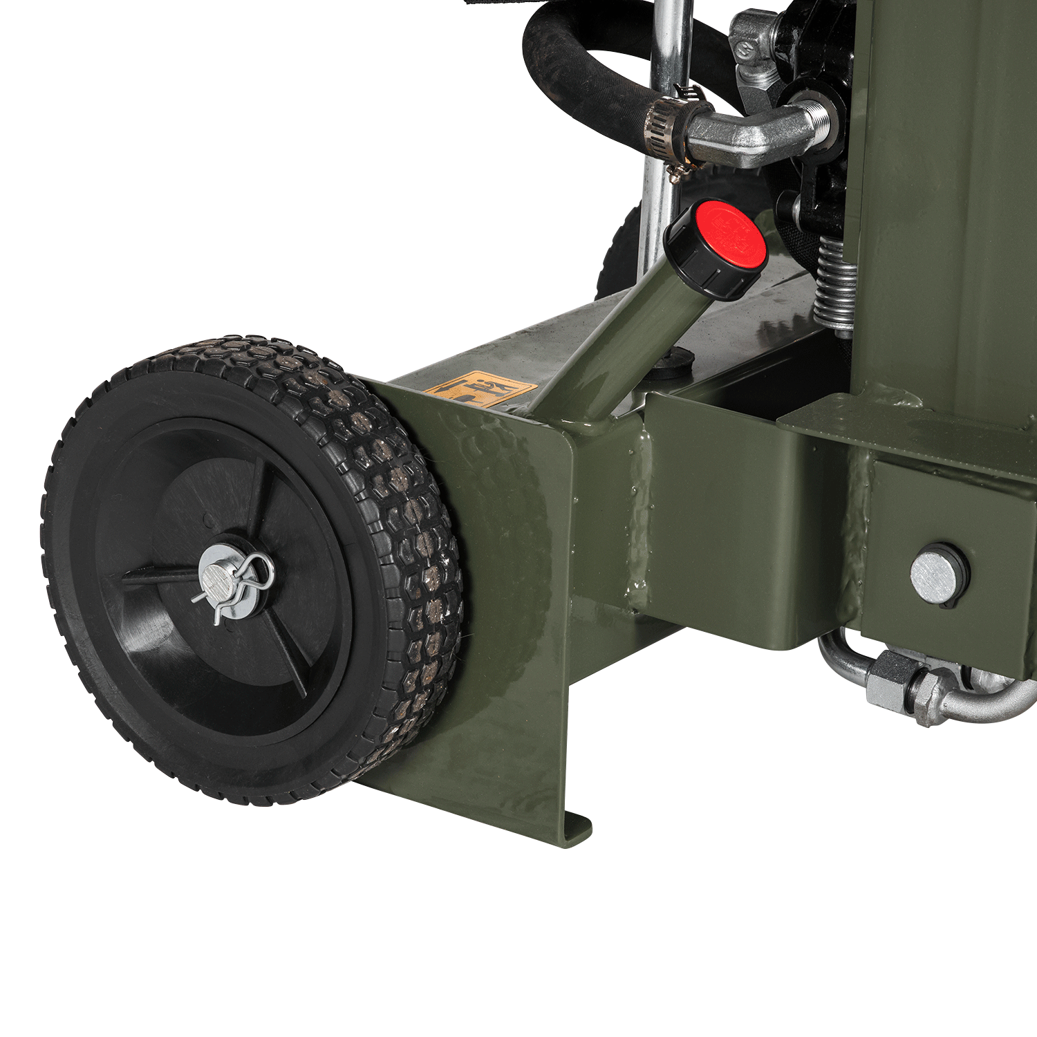 Die verwindungssteife, pulverbeschichtete Stahlkonstruktion des GAMUL-T8 gewährleistet eine hohe Standsicherheit. Damit entspricht das Gerät den neuesten Sicherheitsstandards. Für eine einfache Handhabung ist der Holzspalter serienmäßig mit einer Fahrvorrichtung und einem Transportgriff ausgestattet.